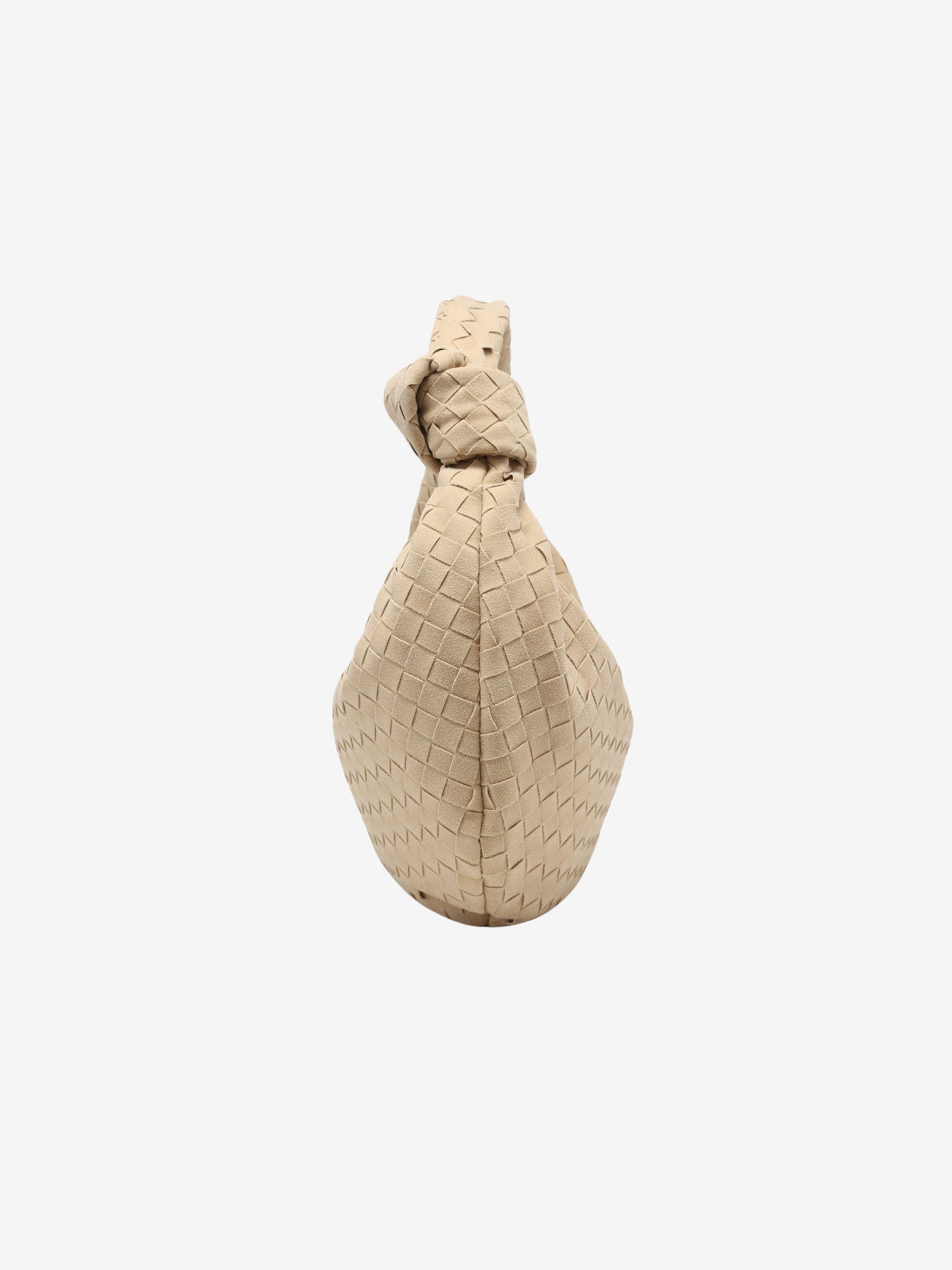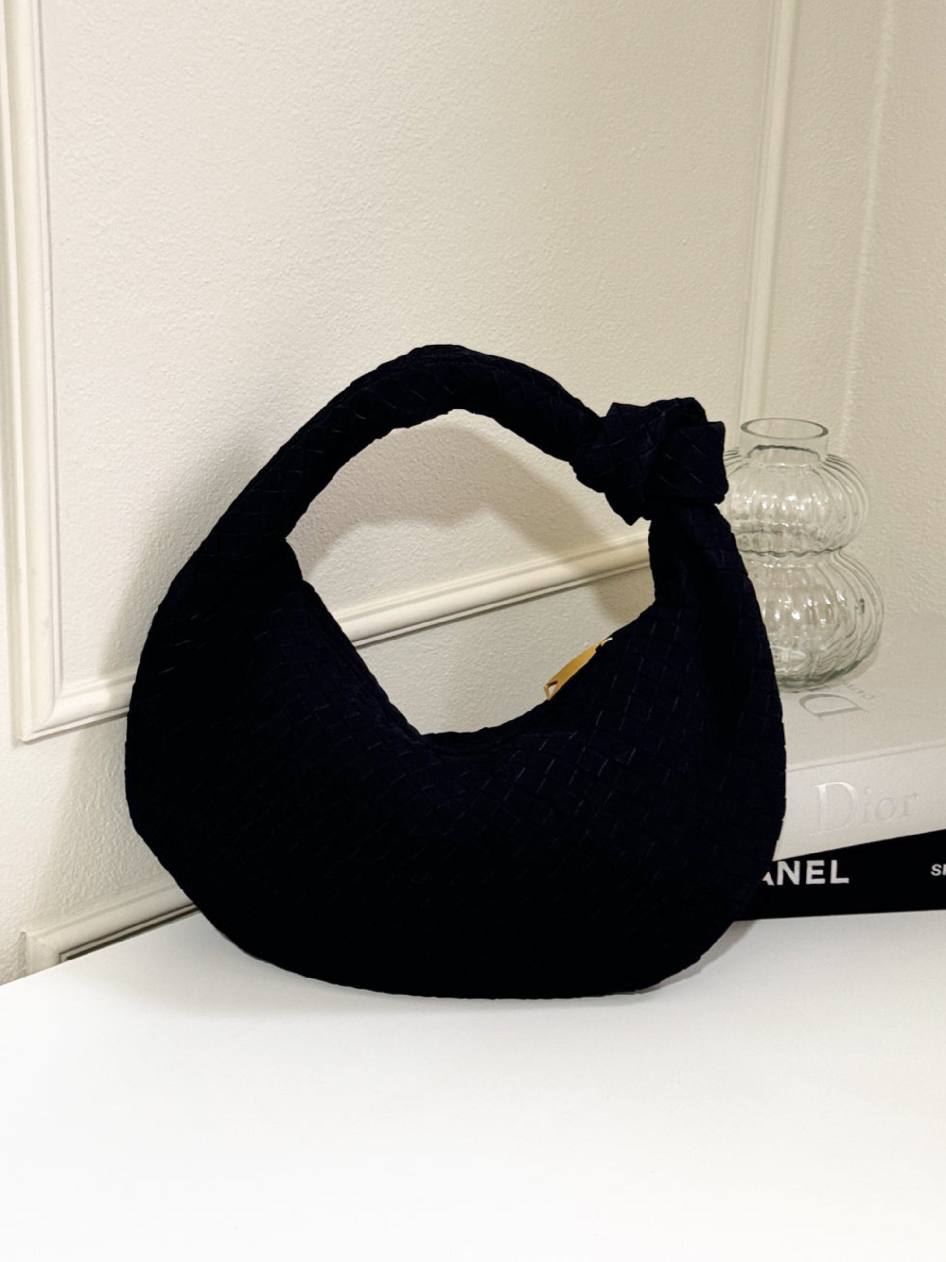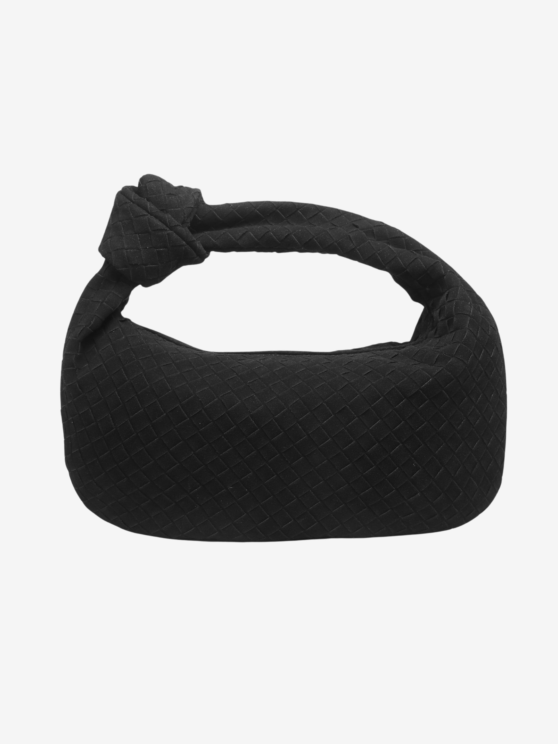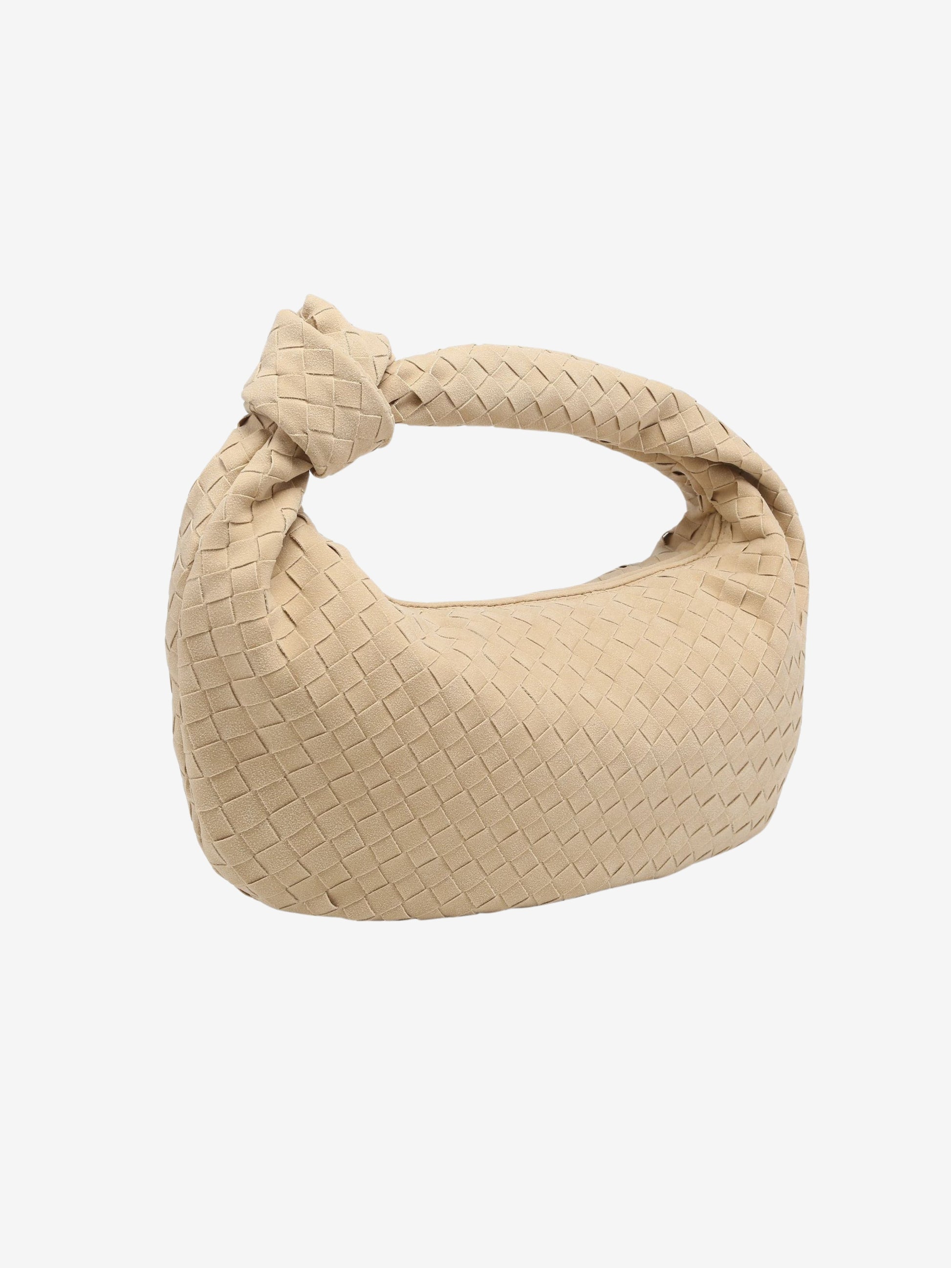 Torba Ava Medium Suede Bag jest stylowa dzięki zaokrąglonemu kształtowi i plecionemu wzorowi podkreślonemu węzłami. Jest bardziej pojemna niż wersja mini i pomieści iPhone'a, błyszczyk do ust i inne niezbędne drobiazgi.
