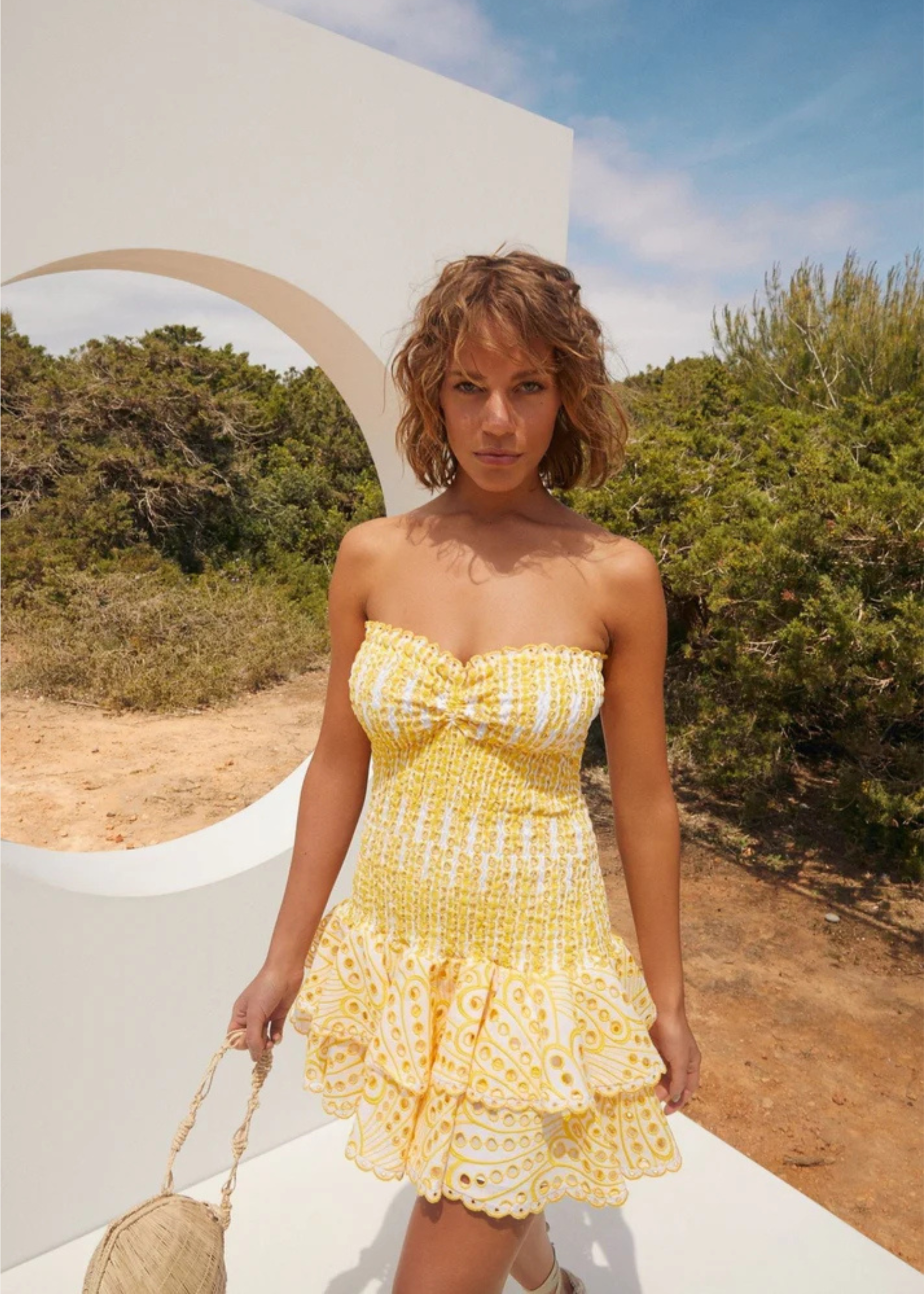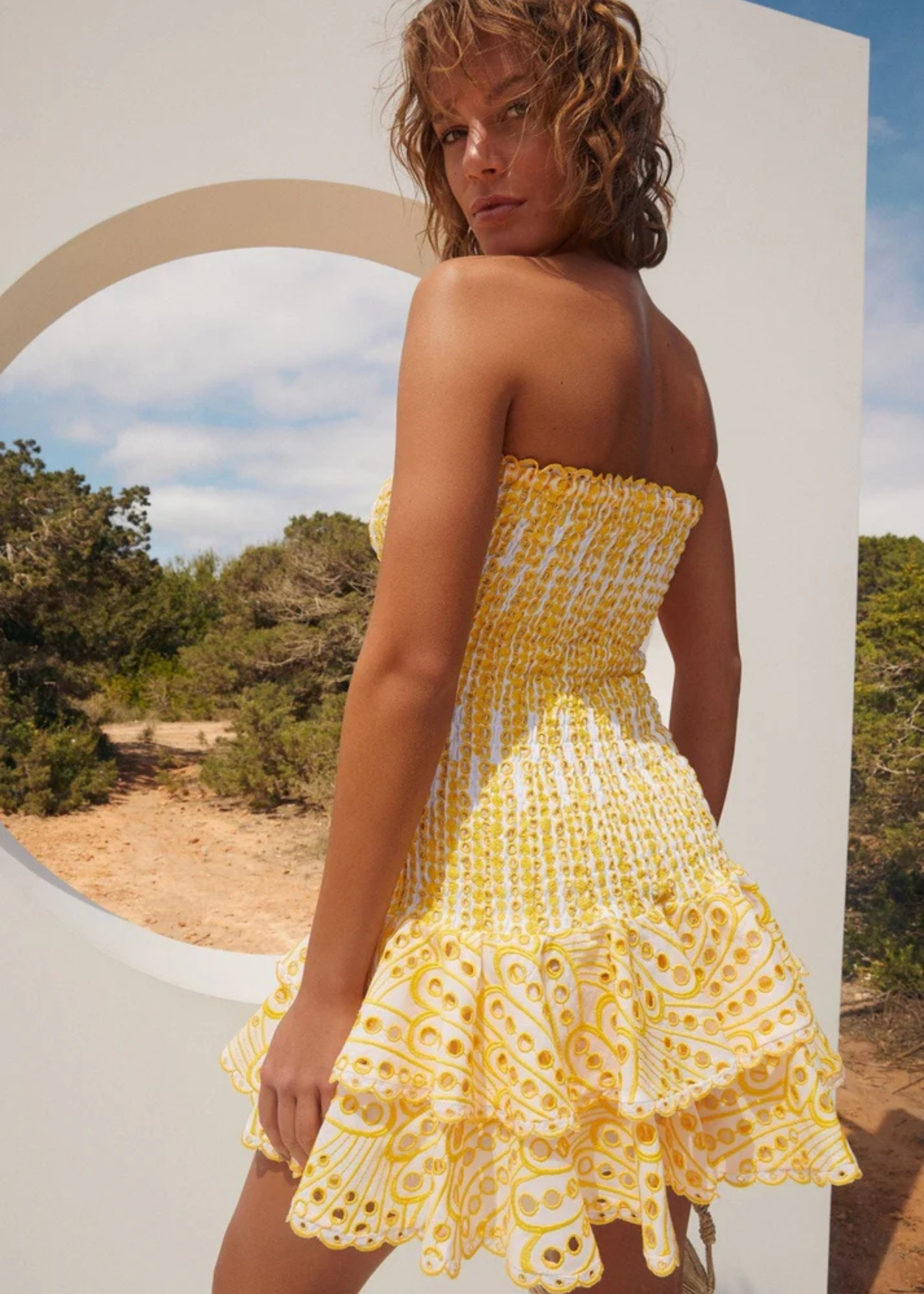 Mini sukienka Dolly Greece Lace nadaje letniej elegancji inspirowanej pięknem Grecji. Delikatna haftowana koronka i dopasowany krój bez ramiączek sprawiają, że sukienka ta jest idealna na imprezy na plaży, letnie wieczory lub wakacyjne wyjścia, zapewniając zarówno styl, jak i wygodę.