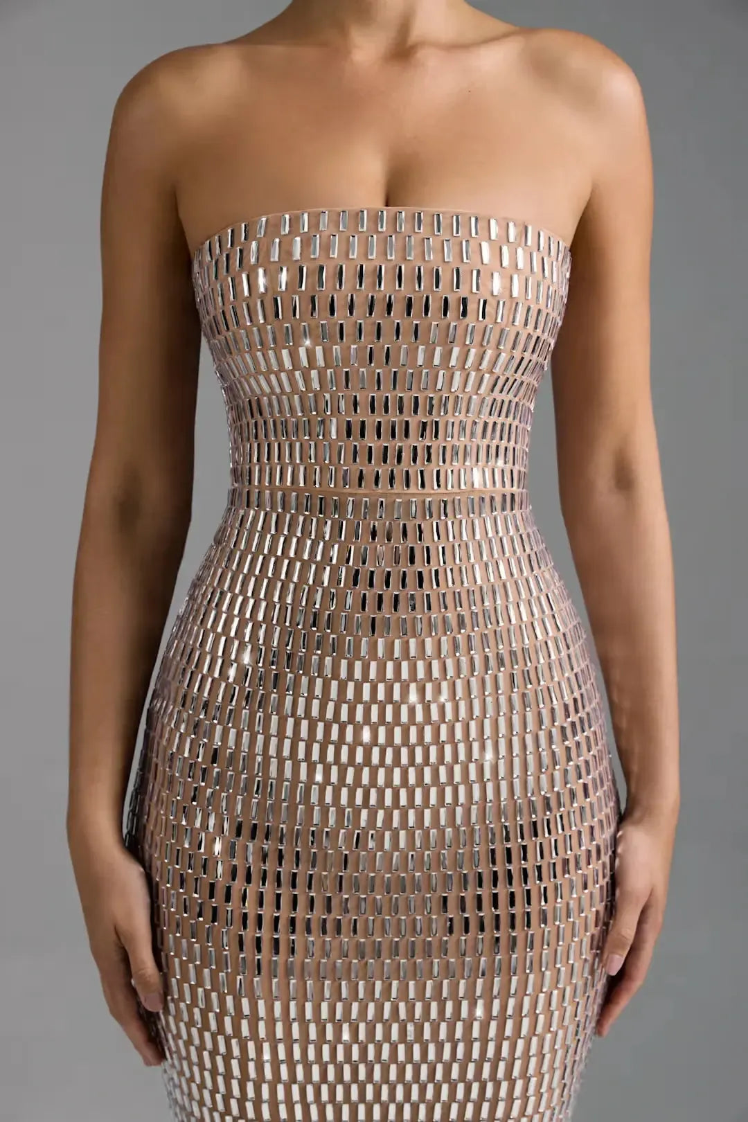 Zrób olśniewające wejście w sukni Lunettaire, rzeźbionej sukni bez ramiączek, która przy każdym ruchu odbija światło. Zaprojektowana, aby przyciągać uwagę, jej odblaskowa powierzchnia i dopasowany krój podkreślą Twoją wieczorną prezencję, nadając jej niebiański charakter.
