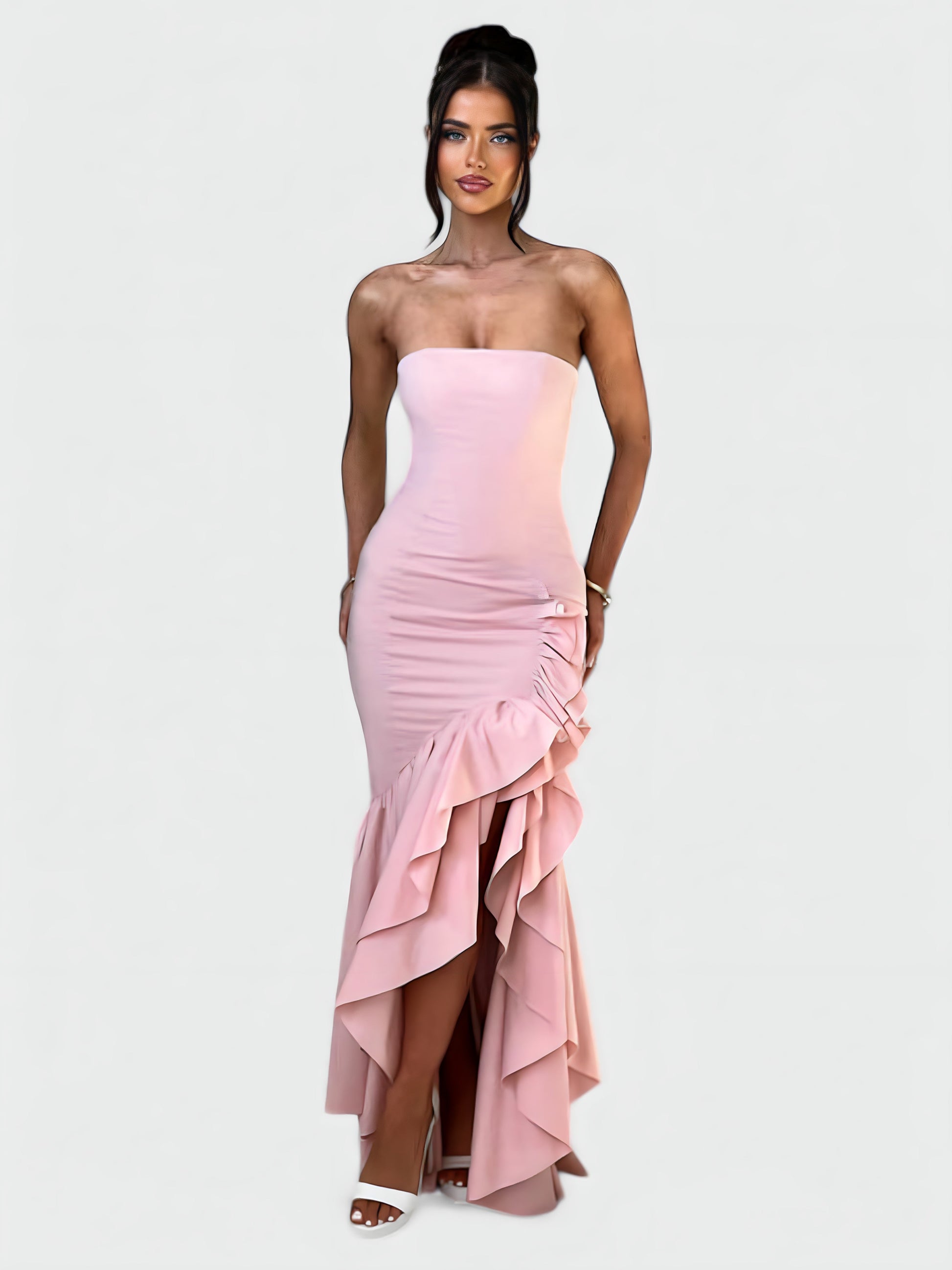 Sukienka maxi Lunaria bez ramiączek z romantycznymi falbanami