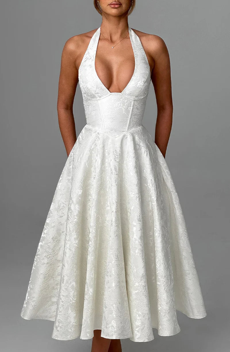 Sukienka Mirella ma oszałamiający krój z podkreślającym figurę dekoltem halter i kwiatowym wzorem żakardowym, idealnym na każdą okazję. Elegancka i ponadczasowa, łączy w sobie wyrafinowanie z odrobiną romantycznego uroku.