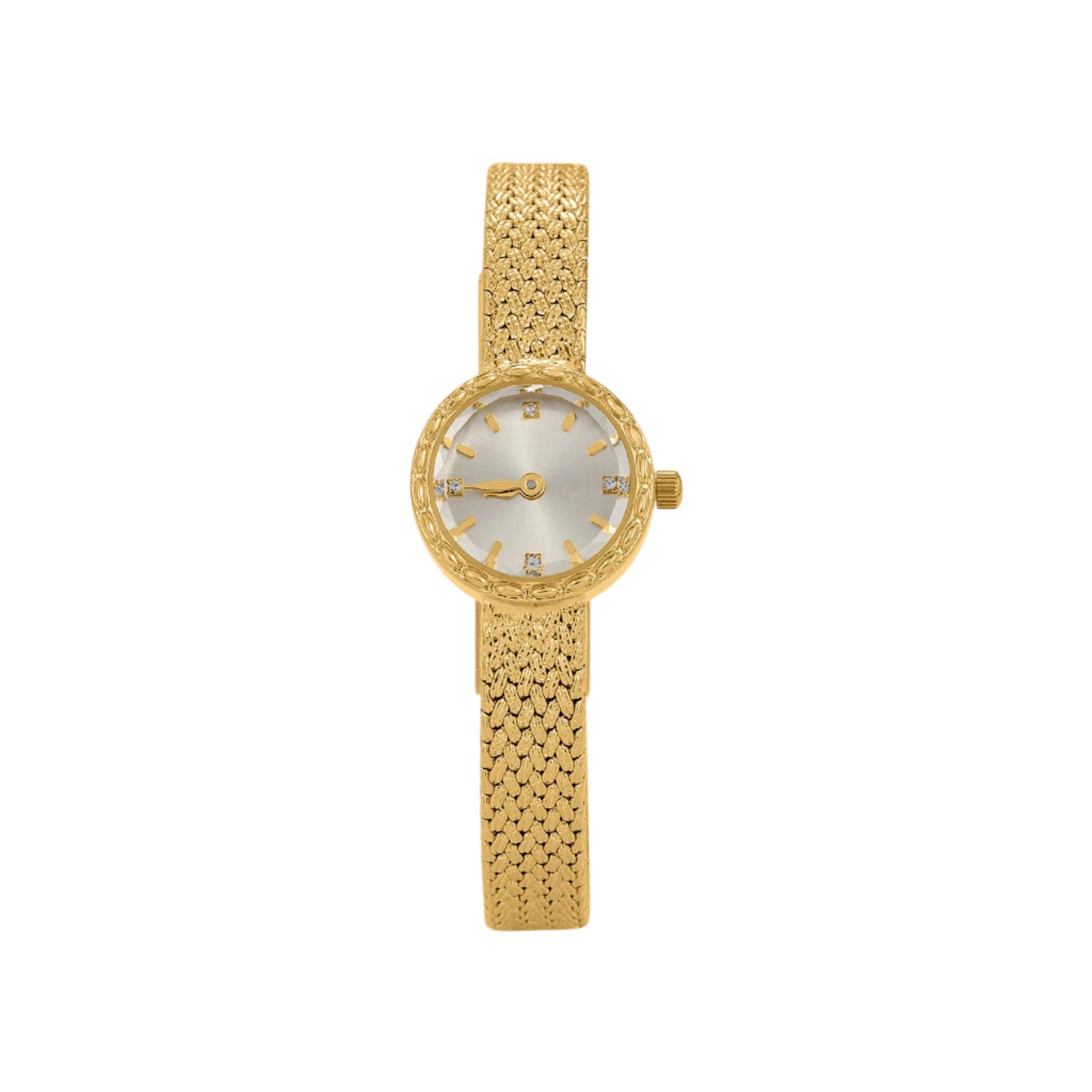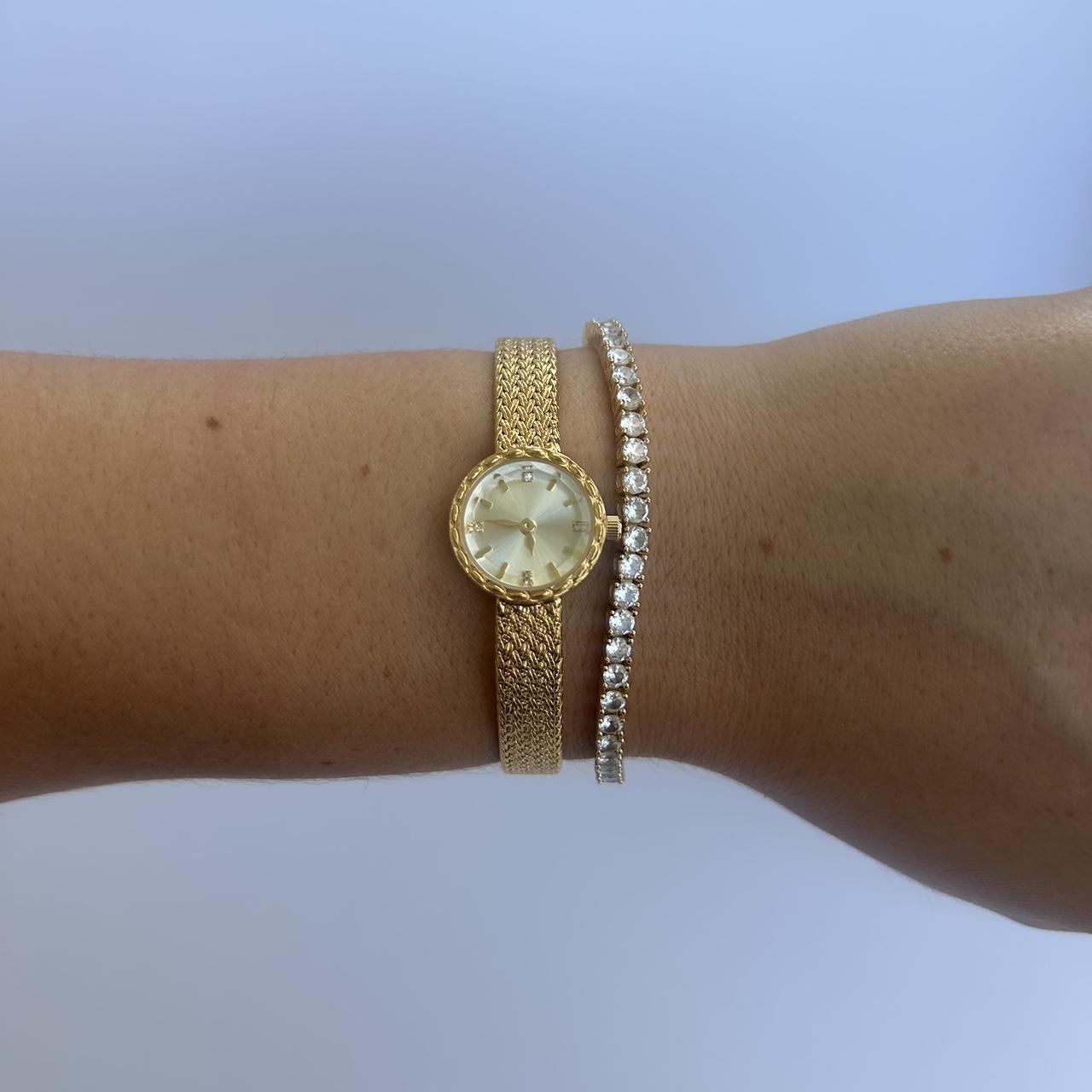 Porada stylizacyjna: Noś w towarzystwie delikatnej złotej bransoletki łańcuszkowej, aby stworzyć bez wysiłku spójną kompozycję na nadgarstku.