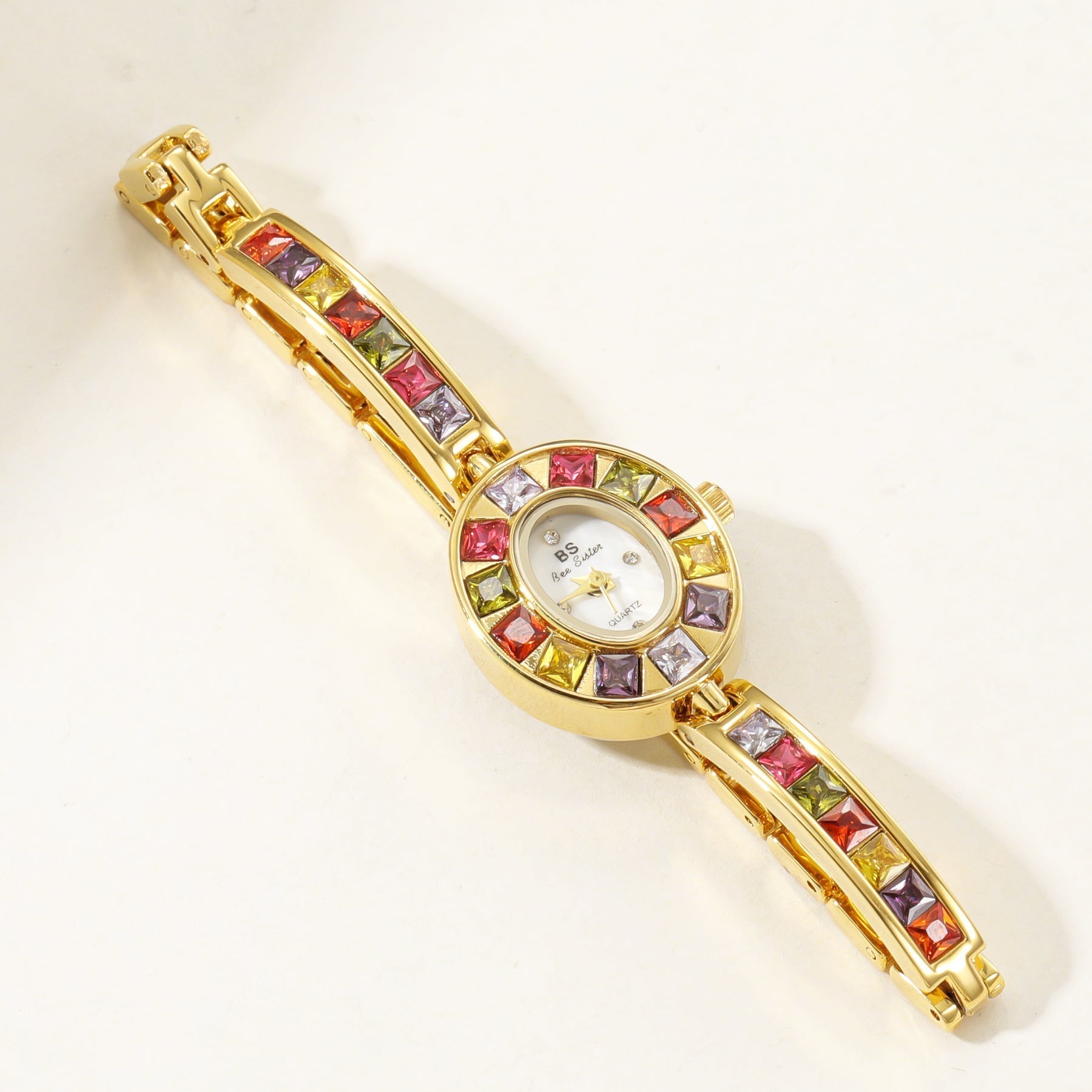 Poczuj ponadczasowy urok z Aurélienne delikatnym zegarkiem na bransolecie, który wnosi na Twój nadgarstek eksplozję kolorów i elegancji. Jego żywe, kryształowe akcenty oraz smukła, złota bransoleta czynią z niego przyciągający wzrok dodatek zarówno na dzień, jak i na wieczór.